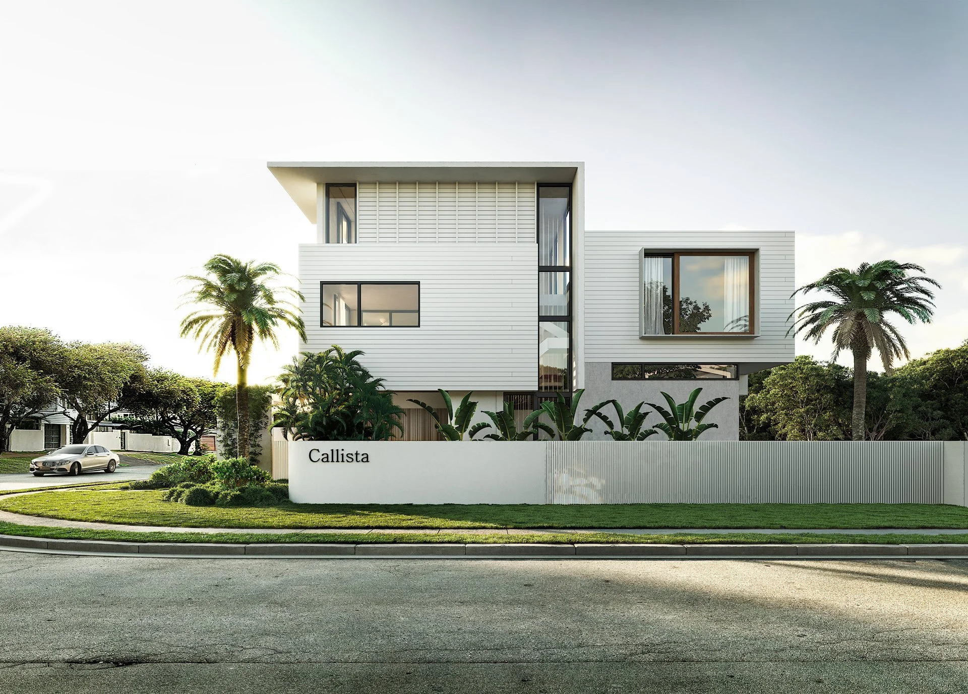 4 villa multi-residential Palm Beach, site constraints of a raised ground floor level to allow overland flow and restrictive height constraints, while still providing a comfortable 4 bed 3 bath luxury villa with double car garage, resulting in open 'split level’ planning.
